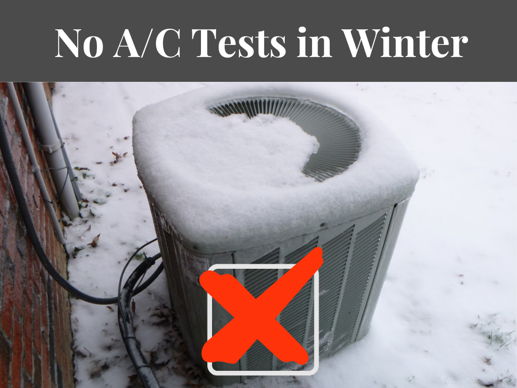 First off, let’s talk Air Conditioning systems. I’m sorry to tell you, but A/C systems can actually sustain damage when operated in cold ambient temperatures, so even if there’s no snow cover, a Home Inspector is not going to be able to perform functionality testing on the home’s A/C system in temperatures below about 60°F or 65°F.